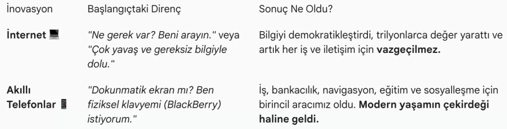 Matbaadan elektriğe, mobil internete kadar her büyük değişimde insanlar başlangıçta bunun gereksiz, karmaşık veya geçici bir heves olduğunu söyleyerek geri adım attılar.